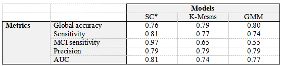 为了将PD患者区分为‌认知正常‌和‌MCI‌两类,作者评估了‌高斯混合模型(GMM)‌、‌K-Means和‌谱聚类(SC)三种聚类算法‌。结果表明,SC算法‌在识别MCI方面表现最优。SC模型的‌受试者工作特征曲线下面积(AUC)‌为‌0.81‌,高于GMM模型的0.74和‌K-Means模型的0.77。SC‌敏感性‌达到‌0.97‌,远高于另外两种模型,表明它能更有效地识别出真正的MCI病例(如下表)。