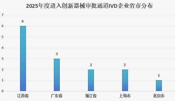 从省份分布来看,本次进入国家药监局创新医疗器械特别审查程序的14家体外诊断(IVD)企业呈现出明显的区域集聚特征,整体上高度集中于东部沿海及一线创新高地。江苏省以6家企业位居首位,占比超过四成,凸显其在体外诊断领域扎实的产业基础和较强的创新转化能力。广东省也有多家企业入选,体现出粤港澳大湾区在创新医疗器械转化和应用端的活跃度。整体来看,这些企业高度集中于我国生物医药和体外诊断产业基础较好、创新资源密集的区域,反映出创新医疗器械申报与区域产业集群之间的高度关联。