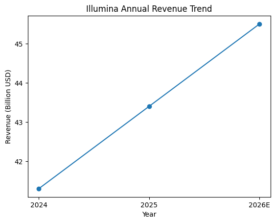 图注:Illumina 2024–2026E 年度营收变化(2026E 为公司指引中值)