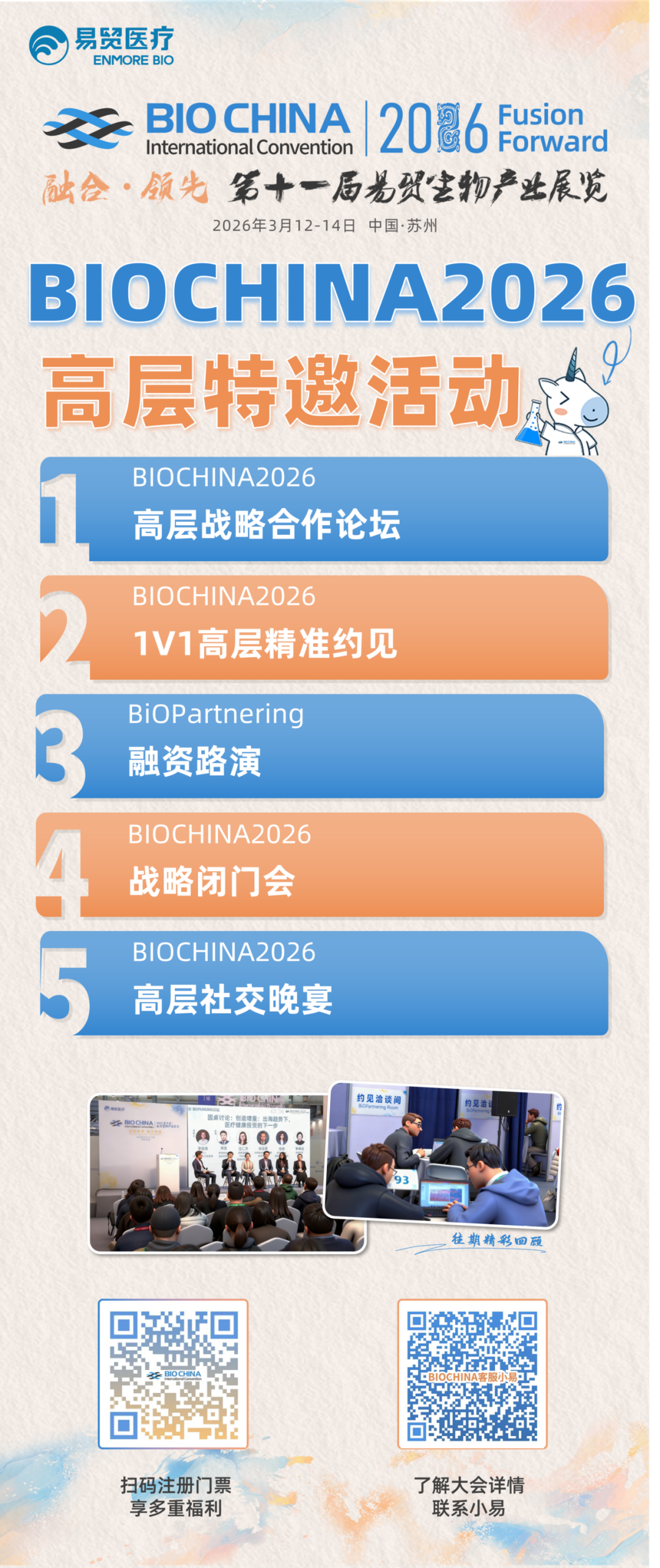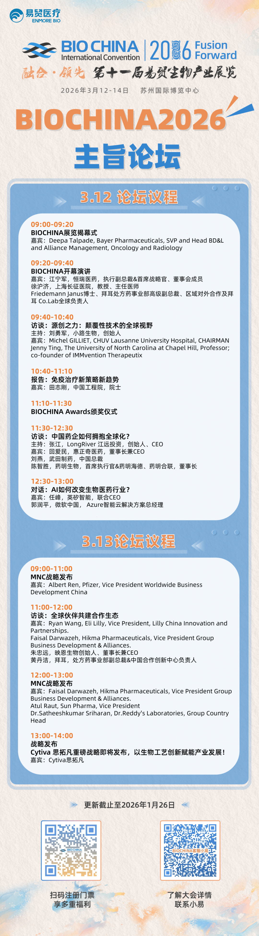 这里有巨头企业的战略布局风向,有前沿赛道的技术突破成果,更有海量高价值的合作机遇。3月12-14日苏州国际博览中心BIOCHINA2026 邀您与全球生物医药领军者面对面,共探行业发展新机遇,共赢全球市场新未来!