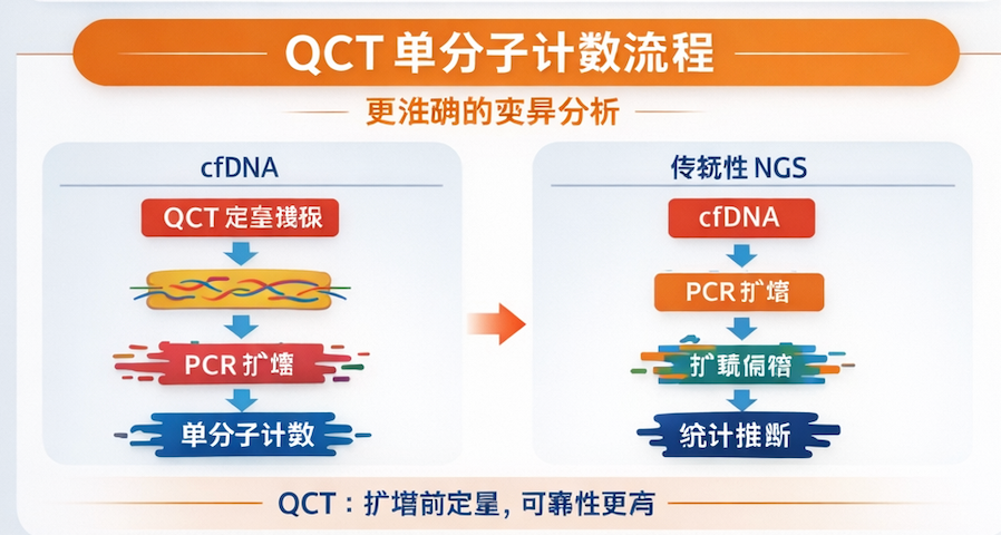 与传统 NGS 依赖扩增后统计推断不同,QCT 在扩增前引入定量模板,使每个 cfDNA 分子拥有可追踪的计数标记,从而实现真正意义上的分子计数,而非相对比例估算。