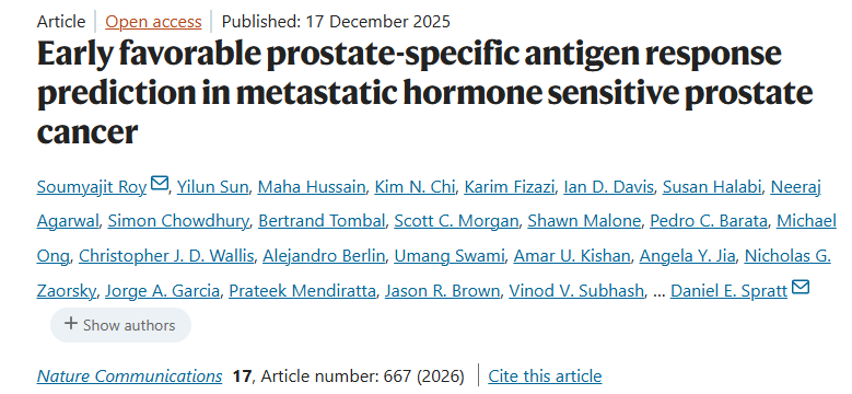 近日,来自全球多所顶尖大学和癌症研究中心的庞大研究团队在杂志Nature Communications上发表了一篇题为“Early favorable prostate-specific antigen response prediction in metastatic hormone sensitive prostate cancer”的文章。本研究利用四项III期随机试验中容易获取的临床和实验室数据,开发并验证了 “NADIR”逻辑回归模型。该模型能够有效预测mHSPC患者在启动ARPI治疗后6个月内实现PSA≤0.2 ng/mL这一有利早期应答的概率,并且该预测概率与患者的总生存期显著相关。根据预测概率的分层显示,PSA 反应率分别为 92%、74%和 39%。此模型有潜力整合到临床决策流程中,助力实现更早期的风险分层和治疗策略选择,最终可能改善mHSPC患者的临床结局。