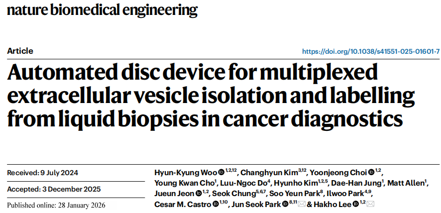 近日,来自美国和韩国的研究团队合作在杂志Nature Biomedical Engineering上发表了一篇题为“Automated disc device for multiplexed extracellular vesicle isolation and labelling from liquid biopsies in cancer diagnostics”的文章。作者设计了一种名为SpinEx的紧凑型圆盘设备,可自动分离全血样本中的EV并进行多重免疫标记。在一项初步临床研究中,SpinEx 处理的囊泡能够以90%的准确率和97%的特异性区分癌症样本和非癌症样本,并以96%的准确率对5种肿瘤类型进行分类。这些结果说明,SpinEx能够实现从血液中自动且多路处理EV,这可能有助于开发出临床上可行的癌症检测和分类检测方法。
