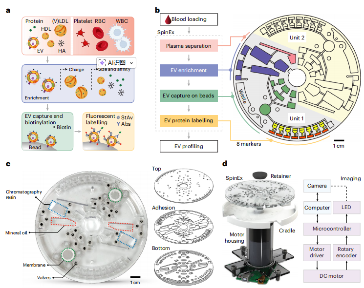 摘要: 作者设计了一种名为 SpinEx的紧凑型圆盘设备,可自动分离全血样本中的EV并进行多重免疫标记。