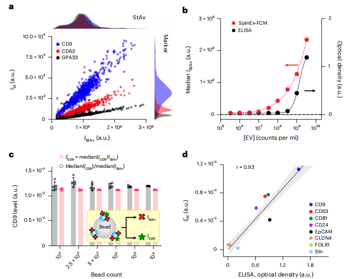 作者最终对优化的SpinEx系统进行了‌灵敏度与定量准确性的测试,结果显示,检测限约为‌8.4 x 10^5 EVs/ml (下图b)‌,比传统的‌酶联免疫吸附法(ELISA)‌ 的灵敏度‌高出两个数量级以上。此外,为了进行定量标记物分析,研究人员开发了一种比率计量法‌,即计算每个微珠上蛋白标记信号与总EV信号的比值,有效地消除了不同微珠之间差异性囊泡负载所引起的变异。这种方法使变异系数降低了约10倍,产生了高度一致的标记物表达结果(下图 c)。