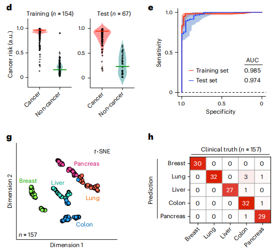 作者使用约70%的样本作为训练集,使用‌支持向量机(SVM)‌ 训练分类器,生成癌症风险评分。结果显示,该模型在‌训练集‌上达到灵敏度95%,特异性97%,准确率96%;在‌独立的测试集(67例)‌ 上,该模型的灵敏度80%,准确率达‌90%‌,特异性‌97%‌,受试者工作特征曲线下面积(AUC)高达‌0.974 (图e)‌。
