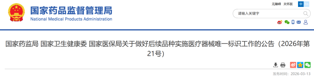 3月13日,国家药监局、国家卫生健康委、国家医保局三部门联合掷下一枚重磅“引信”——《关于做好后续品种实施医疗器械唯一标识工作的公告(2026年第21号)》(以下简称“21号公告”)。这份文件明确了后续医疗器械品种实施UDI(医疗器械唯一标识)的时间表、路线图与责任要求。