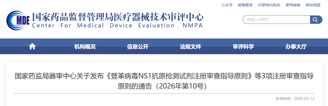 2026 年 3 月 11 日,国家药监局器审中心正式发布了《登革病毒 NS1 抗原检测试剂注册审查指导原则》等 3 项体外诊断试剂注册审查指导原则(2026 年第 10 号通告),为相关产品的注册申报和技术审评提供了明确规范。