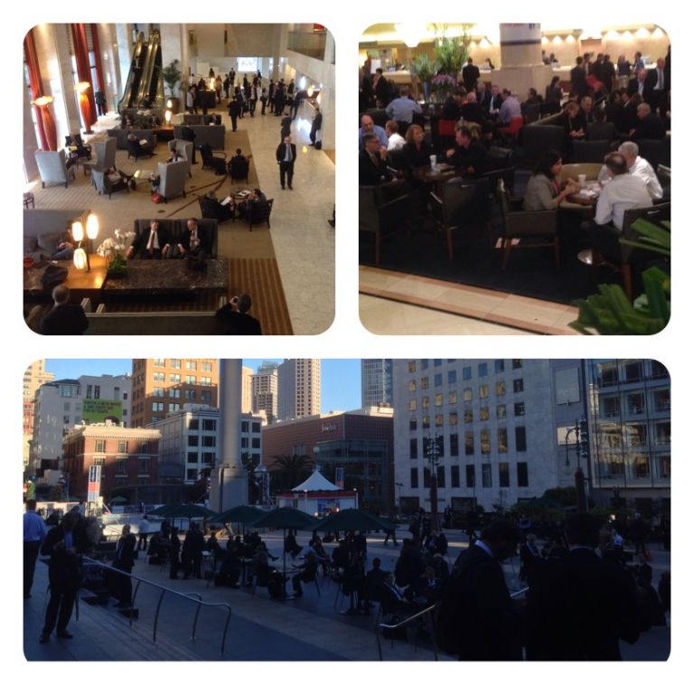 上个星期,我去参加了JP摩尔根医疗大会(JP Morgan Healthcare Conference)。这个会我去过几次了,这回是头一次全程参加,还是在外围,没有正式注册听讲。我是趁开会大家都在一个城市的机会去见人的,而会议的本意则是一些上市公司跟股票分析师介绍新一年的展望的。 这是一个有着三十多年历史的会议已经成为健康医疗行业的一个盛会,有如人们到麦加朝圣一样,似乎成了生物技术和药物开发公司产业化的必经之路。这篇文章介绍了一些有关这个会议背景:今年的会至少有5000人参加,代表投资方,药厂,生物技术公司等所有和医疗卫生产业化有关的几百家公司。 会议每年都是一月份在旧金山举行,市区会场附近的酒店每年都因此大赚一笔,每晚费用高达七八百美金!酒店和会场附近咖啡馆,公园到处是谈生意的公司高管们,当然还有我们这样的创业者: