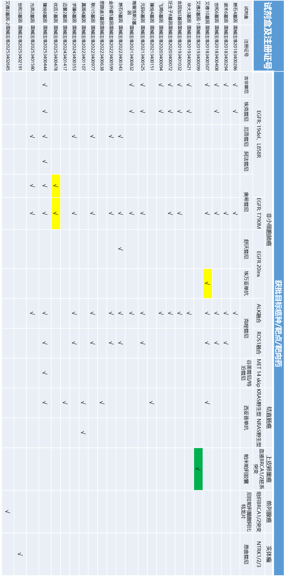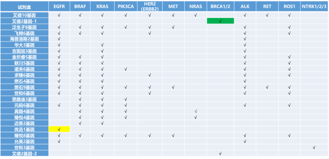 | 图中标黄为血液cfDNA样本(艾德10基因试剂盒组织和cfDNA都有获批,未标),标绿为血液白细胞胚系突变(下同),没标的都是组织样本。1. 真固生物的3基因试剂盒更新,增加了NRAS基因,变为了4基因。同时增加NRAS基因的伴随诊断用途。2. 允英医疗新获批两基因(EGFR/ALK)试剂盒3. 世和基因NTRK1/2/3基因实体瘤泛癌种试剂盒!👍🏻👍🏻👍🏻👍🏻4. 艾德生物BRCA1/2 前列腺癌伴随诊断试剂盒,艾德在2019年已经获批了这两个基因上皮性卵巢癌血液样本的胚系突变的伴随诊断,不知是否是完全相同的panel,这次又拿到了前列腺癌组织样本的伴随诊断!👍🏻👍🏻👍🏻