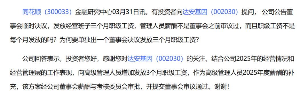 达安基因回复说,这是结合公司2025年的经营情况和经营管理层的工作表现,发放三个月职级工资作为年度薪酬补充。