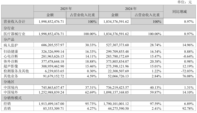 通过业务结构收入表来看,国际收入达到12.53亿元,同比增长14.10%,占总营收比重超过60%,成为业绩增长的核心引擎;分业务板块看,公司六大业务线均呈现积极态势。病人监护业务收入3.09亿元,同比增长12.19%;妇幼健康业务收入6.06亿元,增长14.96%;心电诊断业务收入3.77亿元,增长0.98%;超声影像业务收入3.26亿元,增长8.88%。