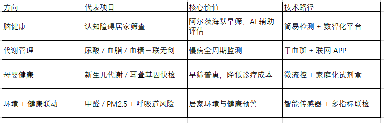 居家检测正从单一指标快检多组学早筛、无创化、AI 穿戴化、服务闭环四大方向升级。未来 12 个月的下一个爆发项目/方向优先级排序如下: