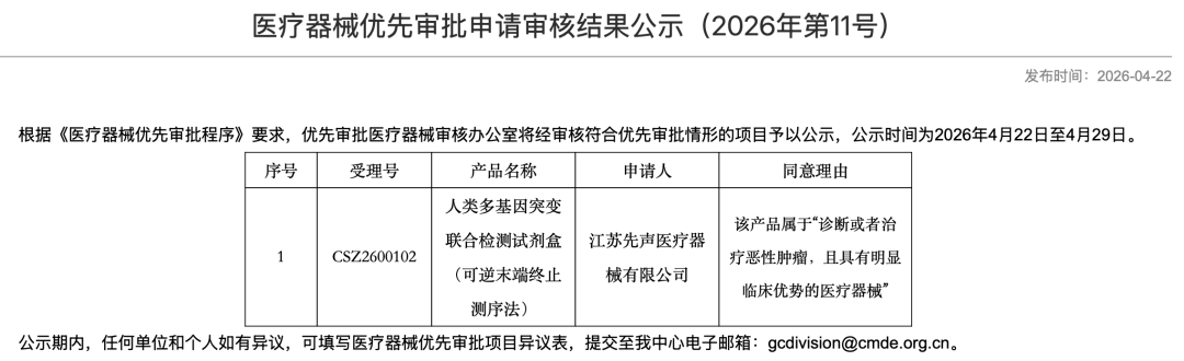 昨天,CMDE公示了2026年第十一批“医疗器械优先审批申请审核结果”。