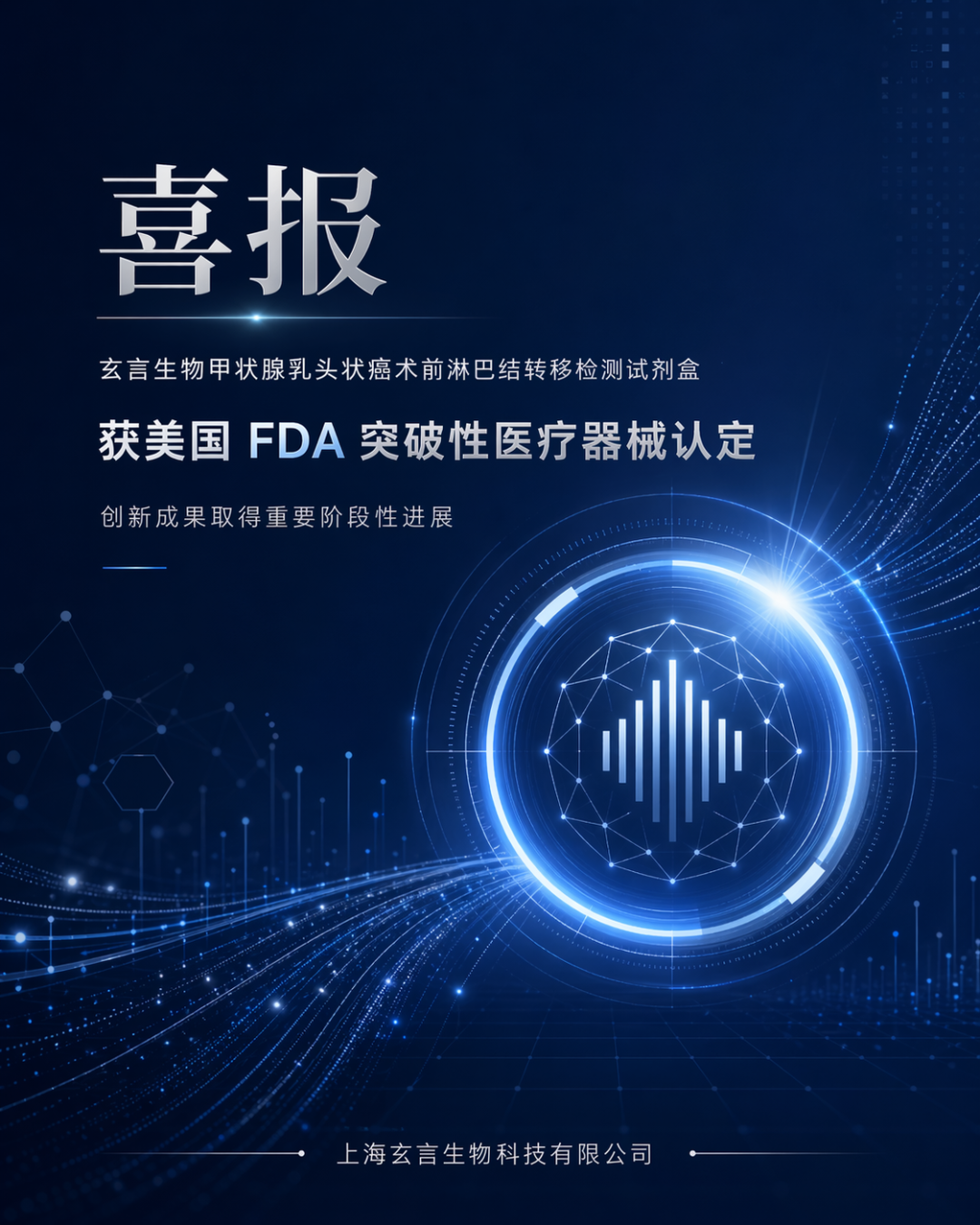 近日,玄言生物自主研发的基于 AI 的 甲状腺乳头状癌术前淋巴结转移检测试剂盒(qPCR 荧光探针法)获得美国食品药品监督管理局(FDA)授予的 Breakthrough Device Designation(突破性医疗器械认定)。这标志着该产品在创新性、临床重要价值及解决未满足的临床需求方面获得了国际权威监管机构的高度认可。 FDA 突破性医疗器械计划(Breakthrough Devices Program)旨在表彰那些有望为严重疾病提供更有效诊断或治疗的创新产品。 进入该计划后,玄言生物将在后续的临床开发与注册审评过程中,获得 FDA 官方法规专家的全流程指导。通过更早期、更高频的沟通交流(包括数据开发计划、临床协议讨论等),将显著缩短产品从研发到获批上市的周期,加速惠及全球患者。 甲状腺乳头状癌(PTC)是甲状腺癌中最常见的类型,术前准确评估淋巴结转移情况对于手术方案的制定至关重要。然而,传统临床检查在转移灶的识别上存在较大局限。 玄言生物此次获认定的产品,创新性地将 qPCR 荧光探针法与自研 AI 算法模型相结合: 分子层面评估: 作为术前辅助性风险评估工具,从分子水平检测相关生物标志物。 精准风险分层: 综合影像学及细胞病理学结果,为医生提供更精准的淋巴结转移判断。 优化诊疗决策: 辅助临床医生实现个体化手术规划,提升患者预后质量。