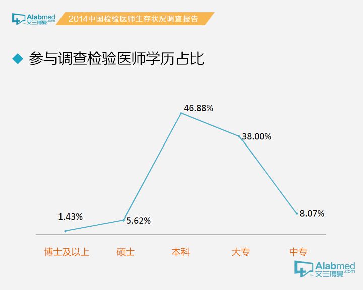 博士及以上学历1.43%、硕士学历5.62%、本科学历46.88%、大专学历38.00%、中专学历8.07%;