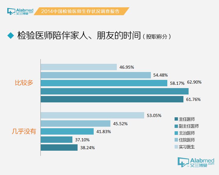 检验医生陪伴家人朋友的情况 相对而言,有较多时间陪伴家人、朋友的检验医生比几乎没有时间陪家人、朋友的检验医生少(分别为44.84%和55.16%),总体趋势呈现工作年限越长、职称越高,越没有时间陪伴家人、朋友。 陪伴家人、朋友时间较多(显著高于几乎没有时间)的情况仅出现在社区卫生服务中心/乡镇卫生服务中心/一级医院(57.41% vs 42.59%)、实习医生/实习技师(53.05% vs 46.95%)、博士及以上学历(57.14% vs 42.86%),以及工作年限1年以下(52.27% vs 47.73%)人群;而陪伴家人、朋友时间很少(极显著低于几乎没有时间)的情况出现在外企/合资医院(25.00% vs 75.00%)、三级医院(33.75% vs 66.25%)、硕士学历(29.09% vs 70.91%)、主任医师/主任技师(38.24% vs 61.76%)和副主任医师/副主任技师(37.10% vs 62.90%)人群。