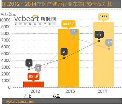 过去3年来,在各领域中,医疗健康领域IPO事件数量增幅领先于所有其他行业,从2012年14起到2013年的54起,再到2014年的115起,成为IPO事件发生最多的领域,复合增长率超过180%。从涉及金额来看,2012年的还仅为8.519亿美元,是7类中量级最小的领域仅占2%,而经过两年则达到了96.85亿美元的量级,复合增长率超过230%,占比提升到11%。
