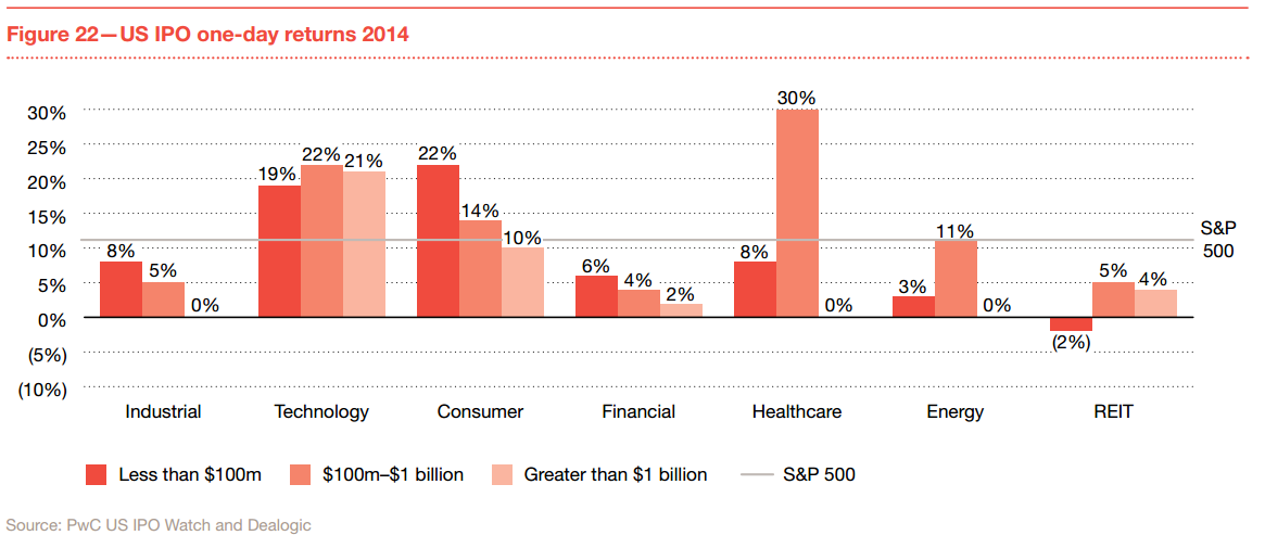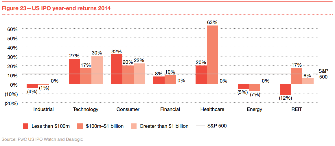 然而根据规模不同,回报率情况有较大的差异。规模在1~10亿美元之间的企业表现最好,其次是小于1亿规模的企业,而规模大于10亿的企业IPO后,无论是首日数据还是年终数据上几乎没有增长。这或许是因为那些估值超高的企业,在IPO当时就已透支了他们的潜力,被追捧过渡,以至于后劲不足。从各行业来看,超大规模IPO收益率都相对较低,而医疗健康行业表现得更为明显。