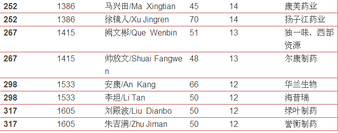 《福布斯》杂志中文版今天发布了2015华人富豪榜,阿里巴巴董事局主席马云、腾讯公司董事局主席兼CEO马化腾、百度CEO李彦宏进入榜单前10名。 其中制药与生物科技领域的富豪有24人,医疗保健设备与服务领域的富豪有3人。究竟他们是谁呢? 以下为医药观察家网根据榜单整理出来的上榜的医药圈富豪们: 2015福布斯华人富豪榜 制药与生物科技领域:24人