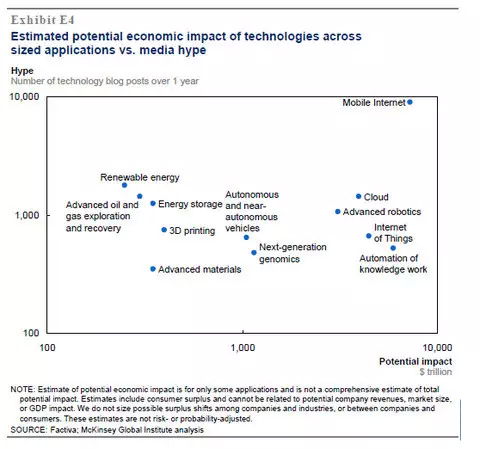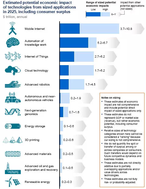如上表所示,麦肯锡认为,未来 10 多年最具经济影响性的技术应该是那些已经取得良好进展的技术—如已经在发达国家普及并在新兴国家蓬勃发展的移动互联网;知识工作的自动化,比方说用计算机语音来处理大部分的客户电话;物联网,比方说将传感器嵌入物理实体中用来监控产品在工厂的流动;以及云计算。按照麦肯锡的估算,到 2025 年,这些技术每一个对全球经济的价值贡献均超过 1 万亿美元(即便是预测的下限)。 不过麦肯锡的报告中令人感兴趣的预测是,一些比较性感的新潮技术,如无人驾驶汽车、3D 打印、可再生能源等的经济影响相对较低。