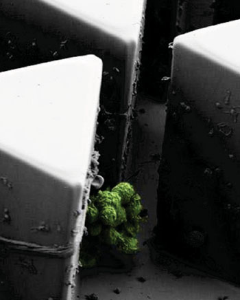 | 现已开发出一种微流体芯片,能捕获罕见的循环肿瘤细胞群,为了解肿瘤的扩散方式提供了重要的新见解。 肿瘤从原发肿瘤部位扩散至身体其他部位的方法之一是肿瘤细胞从原有部位分离并借助血流移动,这些循环的肿瘤细胞(CTC)非常罕见,单个细胞或成群细胞移动,新设备能捕获这些迁移的癌症细胞非常罕见的细胞群。 ![]() 荧光标记的癌细胞群平衡聚集在细胞群芯片内微柱的顶端(照片由Mehmet Toner博士,教授提供)。 Massachusetts General Hospital(Boston,MA,USA)的科研人员和他们的同事使用新的芯片捕捉和分析来自60名乳腺癌、前列腺癌和黑色素瘤转移患者的CTC群。设计的芯片通过许多微小三角形柱缓慢推动血液流动。这些微柱的排列方式为,每两个微柱推动细胞向第三根微柱的顶端移动。在微柱的顶端,单个细胞(包括血细胞和单个CTC)很容易从微柱的一侧滑动到另一侧,并连续通过芯片,直至达到下一根微柱部位;但CTC群在微柱顶端的左侧,在朝微柱下方拉动的反向力作用下,CTC群平衡悬在柱顶。 为确定名为细胞群芯片的设备的工作效率,研究团队向芯片内引入了荧光标记的细胞群,细胞群的大小在2-30个细胞范围内,并计数捕获的细胞群数量和流出芯片的未检测细胞的数量。血流速度为2.5mL/小时,芯片能捕获99%的含四个或更多细胞的细胞群,70%的含三个细胞的细胞群和41%的含两个细胞的细胞群。显微镜下比较捕获前和捕获后的细胞群,发现芯片整体上对细胞群的完整性没有不利影响。 生物医学成像和生物工程国家研究所(Bethesda,MD,USA)的负责人,Roderic I. Pettigrew医学博士说明,“随着针对免疫系统的癌症治疗方法增多,通过血液监控肿瘤与免疫细胞的相互作用具有很大价值。目前我们对CTC群及其在癌症病情恶化和癌症转移中的作用知之甚少。这项独特的技术可以捕获这些异常罕见的细胞群,以无创的方式进行进一步分析,为了解相关情况提供了一个令人兴奋的机会。这是一种突破性技术,对肿瘤研究有非常大的影响。”本研究已发表于2015年5月18日刊的Nature Methods(自然——方法学)杂志。 |