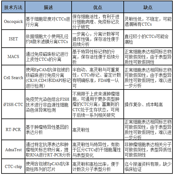 随着肿瘤分子生物学研究的进展,血浆游离循环肿瘤DNA检测技术必将成为临床肿瘤早期诊断、预后判断、跟踪随访等的一项重要的分子生物学检测手段。 液态活检技术之循环肿瘤细胞(CTC)监测技术循环肿瘤细胞(Circulating tumor cell,CTC)是指从实体瘤中脱离出来并进入外周血液循环的肿瘤细胞。 早在1889年的时候,Paget提出了“种子和土壤”的学说,强调癌细胞和微环境之间的关系,并认为肿瘤转移的形成,是处于旺盛生长状态时期的肿瘤细胞作为“种子”,当遇到合适的器官、组织的基质环境,即“土壤”时,就会发生肿瘤的转移。期间有专家提出了“解剖—机械”学说,认为CTC的转移为随机现象,CTC在最先到达脏器的毛细血管或淋巴结发生机械性滞留。1896年澳大利亚学者Ashworth在一例转移性肿瘤患者血液中首次观察到从实体肿瘤中脱离并进入血液循环的肿瘤细胞,并率先提出了CTC的概念。从上世纪末以来CTC检测技术得到了不断的改进,随之带来的是CTC检测在临床的应用。 随着CTC临床应用价值凸显,许多研究机构和研发团队都在推出不同的CTC检测技术。目前,CTC检测技术主要分为以下几种: