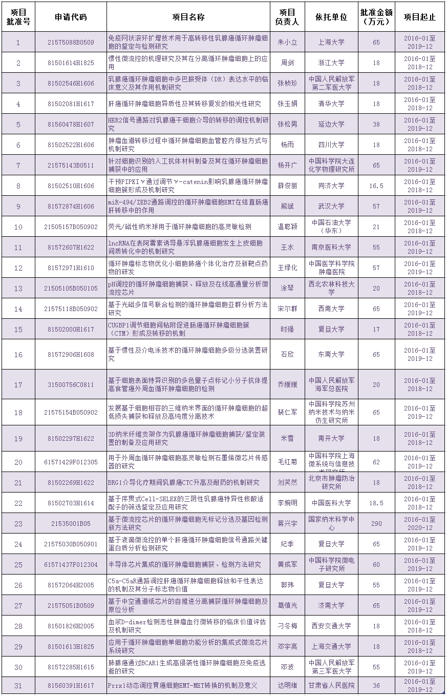 所谓循环肿瘤细胞是指从肿瘤上脱落并进入循环系统的癌细胞,在那里它们可以通过简单的血液检测来发现。这些细胞可作为癌症的生物标志物,指示远端是否存在肿瘤,以及它们的遗传状况和药物敏感性。 自这种细胞被发现后,受到了不少科学家们的关注,不少人纷纷表示这种肿瘤细胞可以作为新一代癌症指示,必将为癌症研究领域带来一场新的变革。国内学者也在这一领域也取得了一些成果,如近期中山大学的宋尔卫教授研究组发文表明DNA检查点抑制剂与损害DNA的传统化疗相结合,可能有效地消除循环肿瘤细胞(CTCs),从而控制肿瘤转移。 而从技术方式上来看,今年获批的项目:“基于微流控芯片的循环肿瘤细胞无标记分选及基因检测新方法研究”希望也能为国内外科学家们开辟出一条研究循环肿瘤细胞的新道路。