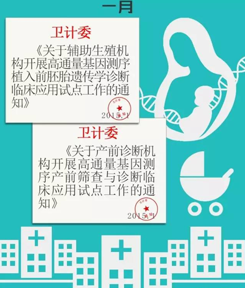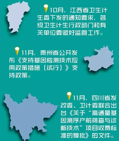 10月,江西省卫生计生委下发的通知要求,各级卫生计生行政部门和有关单位要做好监管工作。在试点期间,未纳入试点的产前诊断机构和不具备产前诊断技术资质的医疗保健机构,不得擅自开展高通量基因测序产前筛查与诊断临床应用。建议按照“属地、就近、互信”的原则,与国家卫生计生委确定的3家江西省试点单位签订工作协议。 11月,贵州省公开发布《支持基因检测技术应用政策措施(试行)》支持政策。政策主要支持以下九个方面:组建网络化基因测序机构体系、支持拓展业务空间、探索纳入医保报销范围、支持基因测序技术研发及产业化、支持人才队伍建设、加大融资支持、落实财税扶持政策、落实政府采购政策、加强组织协调。此次政策提出高龄单独两孩孕产妇出生缺陷基因筛查享受全免费政策。 11月,四川省发展和改革委员会、四川省卫生和计划生育委员会就四川大学华西第二医院《关于我院高通量基因测序产前筛查与诊断技术项目收费的请示》(华西二院[2015]7号)做出了批复,并联合出台《关于“高通量基因测序产前筛查与诊断技术”项目收费标准的复批》的文件,对“高通量基因测序产前筛查与诊断技术”收费标准定为2400元/次。