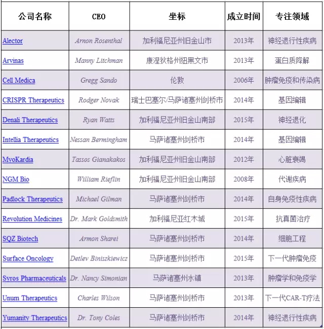 Alector 成立于2013年的Alector公司具有生物技术界的三大灵魂人物——作为CEO的Genentech的老将Arnon Rosenthal,作为科学带头人的哥伦比亚大学神经退化研究学者Asa Abeliovich及作为董事长的Adimab创始人Tillman Gerngross。 该司是一家主要致力于神经退化领域的药物研究公司,研发阿尔茨海默病药物是一项艰巨的任务,最近的许多研究将阿尔茨海默病致病机理关注在毒蛋白质积聚在大脑,但位于旧金山Alector正在采取一种完全不同的方法。Arnon Rosenthal认为阿尔茨海默氏症与免疫系统相关,他希望建立提高人体的自然防御系统,以抵挡神经退行性疾病。 近日,该司获得来源于MRL, Google Topspin及Mission Bay Captial等风投的C轮融资3200万美元,以支持神经退化性疾病的早期研究工作,以研发针对脑破坏型疾病、神经退化性疾病的新方法。Rosenthal表示:接下来几年里,Alector的研究团队针对已确认的12种神经退化性疾病开发主导治疗方法,若该司生产的抗体能通过临床试验,或将找到全球神经退行性疾病的有效疗法。 Arvinas 蛋白质讲解是一个容易理解的科学,成立于2013年的Arvinas公司由于其PROTAC技术而迅速为业内所熟知,公司的这项技术来源于耶鲁大学Craig Crews教授的实验室。 该司独有的蛋白水解靶向嵌合体技术(PROTAC)可以通过激活细胞内部的蛋白降解途径定向降解某些不“受欢迎”的蛋白质,从而将一个个细胞转变为药物单位。这一思路将有望在未来的蛋白质药物研发中大显身手。 今年4月份,默沙东公司以包括预付款、研究经费以及相应的里程碑资金在内的共计4.34亿美元的付款购买了Arvinas公司PROTAC技术,或将成为未来默沙东公司药物开发系统中的一个重要卖点。 Cell Medica CAR-T技术的出现,使得经过基因修饰的T细胞显示出明确的靶向性、对特定肿瘤细胞强大的杀伤活性和持久性的抗肿瘤作用,不仅为过继性细胞免疫治疗注入了新的活力,也标志着肿瘤免疫治疗真正进入了能够与手术,化疗和放疗这些传统肿瘤疗法并列齐驱,并可能在一些晚期、复发、转移和难治性肿瘤患者中完成手术,开启化疗和放疗不能完成的根治性治疗效果的新时代。除了CAR-T为主体的免疫治疗之外,也包括TCR-T,NK,CAR-NK,TIL,γ/δ T细胞和基因修饰的间充质干细胞(MSC)等。 Cell Medica是一家英国的公司,总部位于伦敦,主要领域是肿瘤免疫疗法和传染病,该公司拥有的病毒-特异性T 细胞 (异体)) 针对Epstein-Barr (EB)病毒抗原,可用于治疗进展型NK/T细胞淋巴瘤。美国资深投资人Neil Woodford已经总计投资7800万美元,用于该公司开发T细胞肿瘤疗法。 CRISPR Therapeutics CRISPR Therapeutics是德国亥姆霍兹传染研究中心的科学家、与Jennifer Doudna共同分享300万美金的生命科学奖的Emmanuelle Charpentier与人合伙创办的公司,目前关于CRISPR系统技术的专利还在与另外2家公司争议中。现任CEO罗杰?诺瓦克(Rodger Novak)曾是一名制药行政主管,他说:“知识产权在这个领域是相当复杂的,每个人都知道这其中充满了矛盾。” 该公司在2014年成立于瑞士第四大城市——巴塞尔,通过融资2500万美元资金以开发基于Cas9技术的基因剪切技术CRISPR-Cas9,该技术可以被用于治疗基因类疾病。今年,CRISPR Therapeutics在美国的CRISPR Therapeutics设立了坟墓,是目前美国第二家主攻“CRISPR”基因编辑的生物技术公司。诺贝尔奖获得者Craig Mello等专家都为这家公司提供技术协助。 Denali Therapeutics 今年5月份,生物制药公司基因泰克的三名前高管在2.17亿美元的风险投资帮助下,成立了一家新公司——Denali Therapeutics,专注于治疗神经组织退化疾病,如阿尔茨海默氏症、肌肉萎缩性侧面硬化病(ALS)和帕金森病。 Denali Therapeutics总部设在旧金山,公司联合创始人之一、董事长Marc Tessier-Lavigne是知名神经学家,纽约洛克菲勒大学(Rockefeller University)校长;另一位联合创始人、负责公司日常运营的CEO Ryan Watts是基因泰克公司神经科学总监;第三位联合创始人Alex Schuth为基因泰克公司技术创新和诊断业务主管。 Intellia Therapeutics Intellia Therapeutics是2014年成立的生物技术公司,主要致力于CRISPR/Cas9技术在治疗领域的发展,独家享有一项在CRISPR/Cas9技术治疗领域极为重要的知识产权,并获得了Atlas Venture和诺华的首轮融资。 该司的CEO和联合创始人Nessan Bermingham博士表示,Intellia与诺华的合作将会极大地推动将CRISPR/Cas9转化为实际治疗手段的应用,CAR-T和造血干细胞治疗是CRISPR/Cas9技术极具代表性的应用领域和契机,而诺华毫无疑问是这两项治疗领域的领跑者,与诺华合作可以加速发展产品的研发。 MyoKardia 2012年9月,旧金山一家生物技术公司MyoKardia利用新的基因组方法研发治疗心肌病的药物,寻找因为基因突变而患有此类疾病的患者,不仅计划筛选出针对某类患者的有效药物,同时还计划开启相关药物的伴随诊断测试。 波士顿的风险基金Third Rock Ventures对这家公司投资了3800万美元后,该司专注在治疗肥厚性心脏病和扩张性药物的研发工作,着眼于开发治疗心肌肌节蛋白突变引发疾病的个性化小分子药物疗法,美国有数百万人受这两种疾病的折磨。 2014年9月,法国生物医药巨头赛诺菲公司投资2亿美金里程碑付款给MyKardi,进行治疗心肌疾病相关新药的早期研发工作,包括了两个关于肥厚性心脏病药物研发项目和一个扩张性心脏病药物研发项目,双方计划到2018年完成这一协议研发。 NGM Bio NGM生物制药公司(NGM Biopharmaceuticals, 