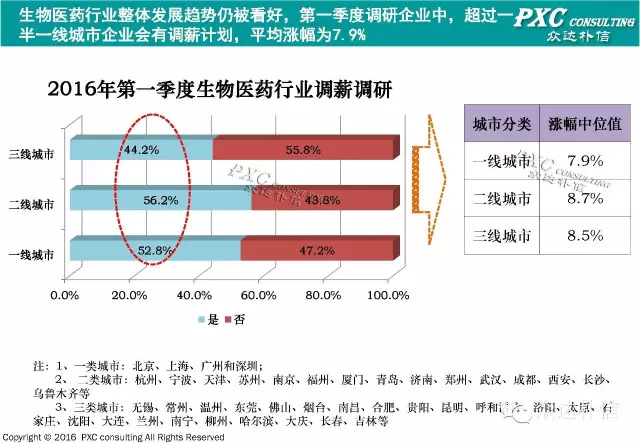 生物医药行业整体发展趋势仍被看好,第一季度调研企业中,超过一半一二线城市企业会有调薪计划,其中一线城市平均涨幅为7.9%。二三线城市由于薪酬水平的基数较低,有些岗位又不得不从一线城市挖掘,涨幅都超过了8.5%。