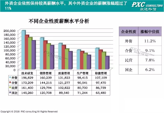 根据笔者的调研结果显示,外资企业依然处于整个生物医药行业的薪酬领先水平,其薪酬涨幅也处于高位,超过了11%。当然最近几年民营企业竞争力也是逐渐提高,关键岗位薪酬水平与外资企业差距逐渐缩小,薪酬涨幅也达到了7.8%的水平。 |