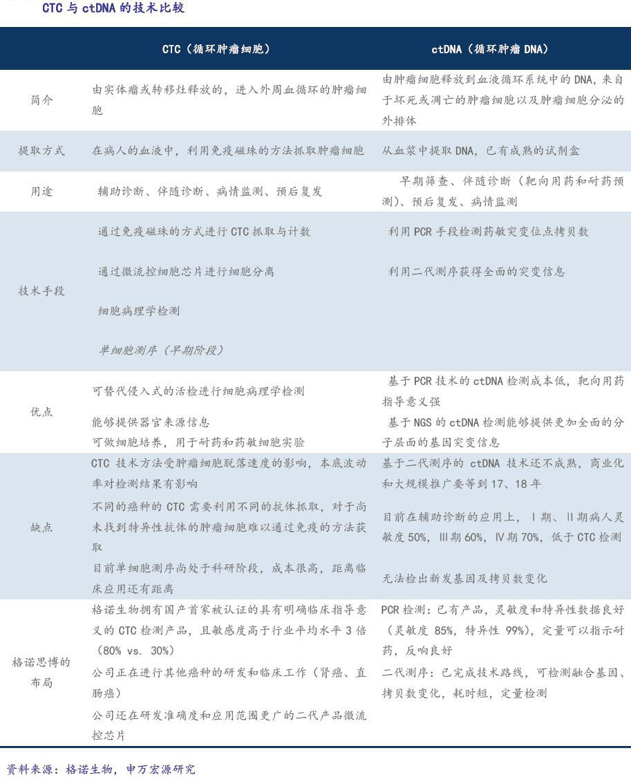 液体活检的来源包括CTC(循环肿瘤细胞)、ctDNA(循环肿瘤DNA)、microRNA(循环microRNA)、Exosome(外泌囊泡小体)等四种,前面两种目前在业界相对热门。microRNA稳定性不好,因此可靠性不强;Exosome本质上与ctDNA是同源的。 (二)主要技术比较:CTC与ctDNA的应用 从应用领域来看,液体活检广泛应用于唐氏综合症等先天性疾病、性别和亲子鉴定、器官排异、以及糖尿病、肿瘤和癌症的预测和治疗。CTC技术和ctDNA技术应用有所不同,CTC细胞携带除基因外更多的信息,但在血液中分布稀少,仅限于数量检测。单细胞扩增技术,将会进一步推动CTC的发展。血液中ctDNA含量多,携带的DNA信息量远大于CTC,分子检测也更加容易。
