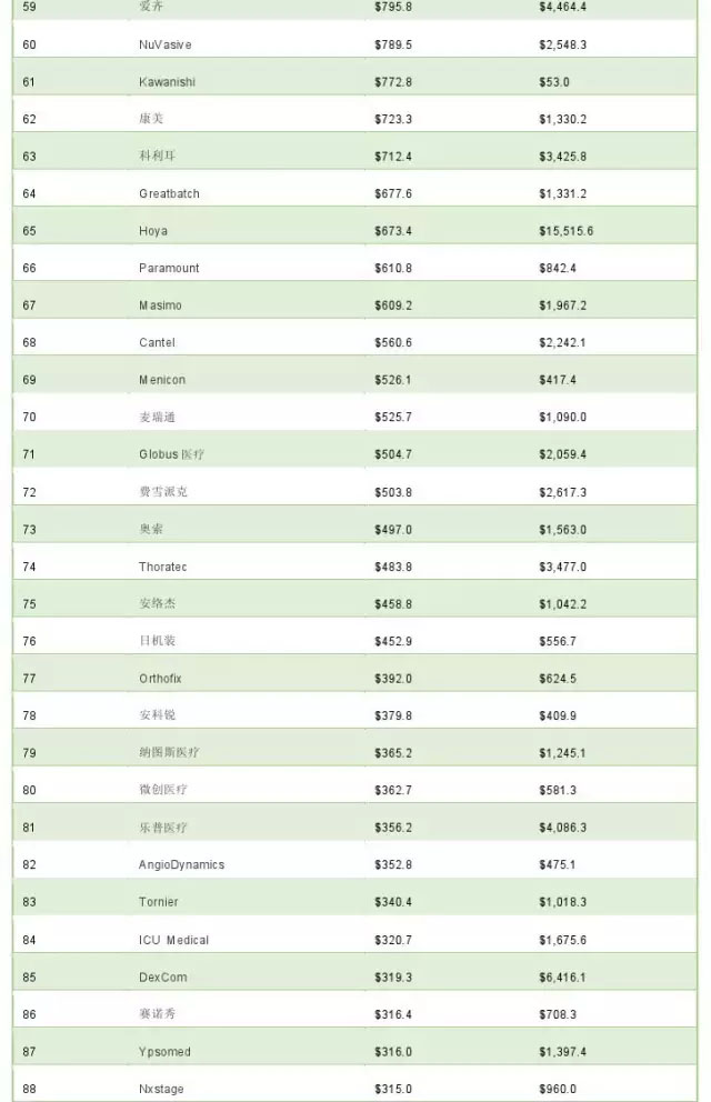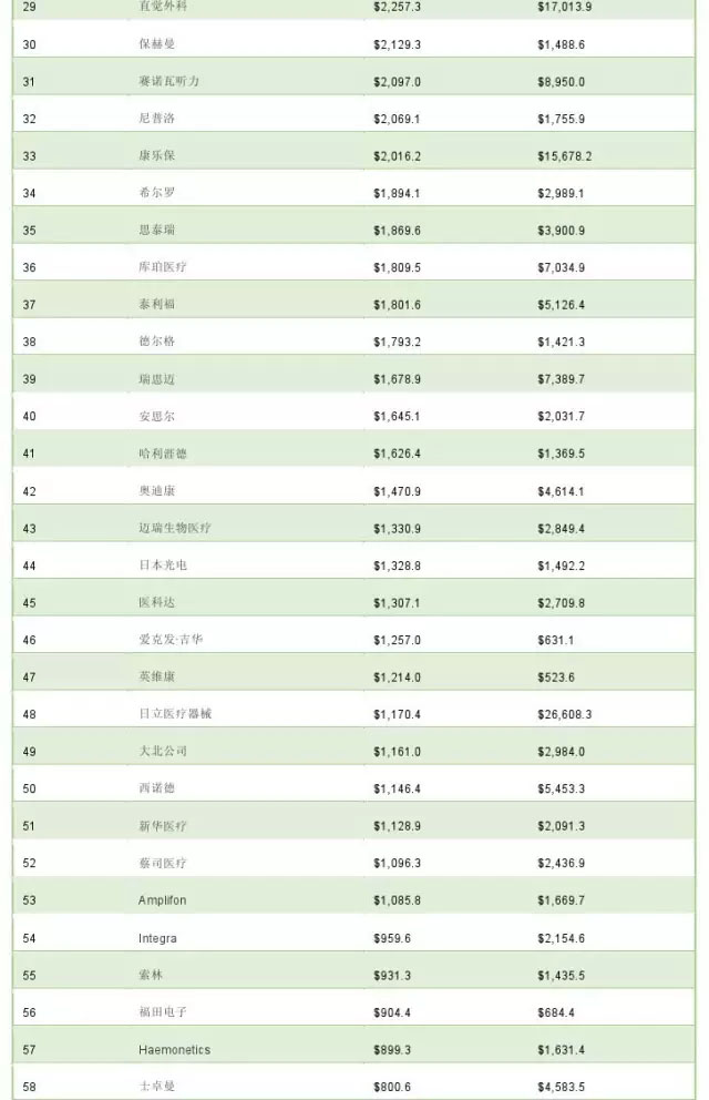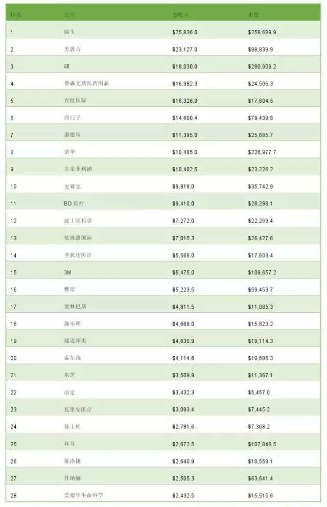 经过几年的并购潮,全球 医疗器械企业的排名已经有了些变化,Qmed为此列出了2015年新的百强排行榜,数据来自标普qixia的S&P Capital IQ数据库。 在这份百强榜中,国内有5家企业入选,分别是深圳迈瑞生物医疗(43)、山东新华医疗(51)、上海微创医疗(80)、北京乐普医疗(81)、江苏鱼跃医疗(92)。 (原标题:2015年全球医疗器械公司100强)