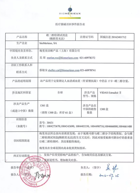 7月25日,里埃诊断产品(上海)有限公司发出报告,对注册证号码为国械注进20162401712的雌二醇检测试剂盒(酶联荧光法)实施主动召回,相关产品货号30431,在中国销量1300盒。