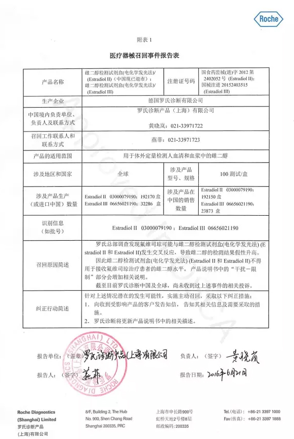 “最近,我局先后收到罗氏诊断产品(上海)有限公司和梅里埃诊断产品(上海)有限公司主动召回雌二醇检测试剂盒的医疗器械召回事件报告。两家公司调查发现,由于氟维司群(Fulvestrant)与雌二醇分子结构类似,可能会与雌二醇检测试剂盒发生交叉反应,因此对接受氟维司群治疗的患者进行雌二醇检测时,雌二醇检测结果假性升高。这可能会误导医生改变或停止使用氟维司群继续治疗,从而影响患者病情。两家公司发出警示:对于使用氟维司群进行治疗的患者,建议不要使用雌二醇检测试剂盒进行检测。 目前,在全球范围内,两家公司尚未收到类似投诉。 上海市食品药品监督管理局慎重提示:关注雌二醇检测试剂盒用于接受氟维司群治疗患者检测诊断的风险。 上海市食品药品监督管理局要求企业加强上市后医疗器械风险监测,采取有效措施,主动召回存在不合理风险的医疗器械。” 三大巨头已先后发布召回公告 上海药监局在其公告中提到,该局先后收到罗氏诊断和梅里埃诊断的主动召回报告。不过,据赛柏蓝器械了解,发出主动召回事件报告的还有奥森多。 6月21日,罗氏诊断产品(上海)有限公司最先报告,对注册证号码为国食药监械(进)字2012第2402052号的雌二醇检测试剂盒(电化学发光法)/(Estradiol II)(中国现已退市)、以及注册证号码为国械注进20152403515的Estradiol III产品实施主动召回。其中,前者在中国的销量为192150盒,后者在中国销量为23873盒。