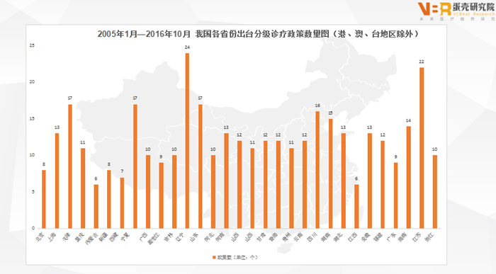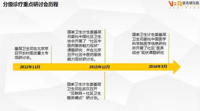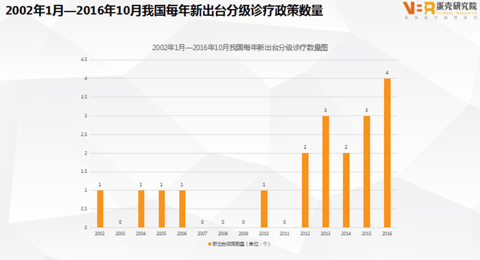 2002年—2016年10月我国每年新出台国家级政策数量图 由上图可知,2002年至2011年,我国每年国家级政策出台的数量较为稳定平缓。2012年至2016年,数量增多,且频率相比前10年大幅加快。分级诊疗成为国家医改的重头戏。 其中主要有9大重要节点: