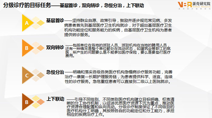 分级诊疗的关键内容 建立分级诊疗制度需实现慢性病、常见病、多发病的基层首诊和转诊,并构建布局合理、层级优化、功能完善、协同联动的城乡医疗卫生服务体系,结合疾病诊疗特点,围绕患者预防、治疗、康复、护理等不同需求提供科学、适宜、连续、高效的诊疗服务。分级诊疗制度的关键内容为不同级别医院“分工”明确。