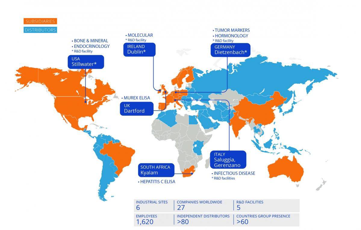 今天推出《11大IVD巨头企业发展史汇编》系列第十篇——— DiaSorin S.p.A. 1 公司概况 简介 意大利Diasorin S.p.A.创建于1968年,是全球体外诊断市场的领导者。曾是意大利Sorin Biomedica SpA的体外诊断部,2000年部门高层认购全部股票后独立出来成立DiaSorin S.p.A.,为意大利独立上市公司,作为FTSE Italia Mid Cap Index(盘中指数)的一员。具有近50年生物医学领域的研发经验,其放射免疫和酶免疫在欧洲及全球享有极高的知名度,一直致力于医院及私人实验室的免疫诊断,及分子诊断测试。 截至至2015年底,DiaSorin员工超过1600人,超过80个代理商。公司目标:Improving the health and quality of people’s lives。 部门分布 Diasorin于全球共6家工厂,5间研究实验室,27间分公司,销售网络遍布全球100+国家。 研发能力 发展历程 2 收并购介绍 3 营收情况 2015年年销售额: |