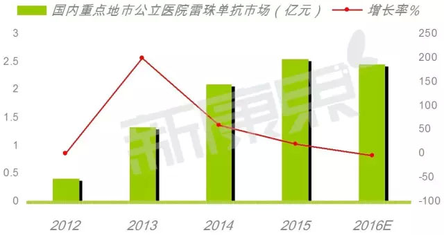 随着生物单抗专利到期,国内已进行了仿制生物制品的研究开发。据CFDA最新数据,国内有多家获得临床批文。 利妥昔单抗2016年已由正大天晴药业集团获得临床批文(利妥昔单抗CXSL1500056苏),华兰基因工程的重组抗淋巴细胞瘤(CD20)单抗 (利妥昔单抗) 获得临床批文(CXSL1400096豫),海思科公司的生物药物“HSK-III-001注射液” 获得临床批文(2016L10582)。 销售位居市场第二的曲妥珠单抗2016年国内已有两家企业获得临床批文,分别是正大天晴药业集团的注射用曲妥珠单抗(CXSL1400013苏),华兰基因工程的重组抗人表皮生长因子受体2(HER2)单抗(曲妥珠单抗) 注射用药(CXSL1400077豫)。 销售位居市场第三的贝伐珠单抗国内2016年也有两家企业获得临床批文,分别是正大天晴药业集团的贝伐珠单抗注射液(CXSL1400137苏),上海恒瑞医药的贝伐珠单抗注射液(CXSL1400076苏)。 销售位居市场第四的西妥昔单抗则由佛山安普泽生物医药获得临床批文(CXSL1400090粤)。 雷珠单抗-竞争AMD 雷珠单抗是基因泰克开发的产品。2006年美国FDA批准雷珠单抗,用于治疗新生血管性老年黄斑变性(AMD),商品名Lucentis。瑞士诺华公司获得了美国以外市场的销售开发权;老年性黄斑变性是全世界工业发达国家中,导至老年患者失明的首要原因,属于第三大致盲性眼病。2011年12月获CFDA批准诺华的雷珠单抗注册,商品名为诺适得。 数据显示,2012~2015年中国重点城市公立医院雷珠单抗市场表现出逐年增长态势,2015年公立医院诺适得的销售额为2.54亿元,同比上一年增长了20.99%。随着成都康弘的康柏西普上市,在激烈竞争下雷珠单抗销售缓慢下滑,预计2016年国内重点城市公立医院雷珠单抗市场为2.46亿元,同比上一年下降了3.27%,是TOP抗体药物中居第四位的品种。