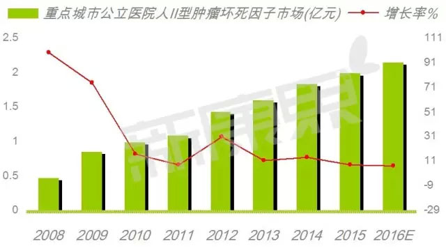 随着国内外眼科技术市场的接轨,成都康弘的康柏西普的上市,我国眼科技术有了快速发展,眼病的诊断和治疗水平的长足迈进。客观上也导至了我国老年人黄斑变性的发现率呈现出增长态势。据统计数据显示,中国每年约有30万新发的年龄相关性黄斑变性患者。随着全球老龄化社会的全面到来,以及电子视屏及手机LED屏幕蓝光对眼睛的直接影响,对眼睛黄斑区造成和加速了不同程度的伤害,预测眼科用抗体药物仍是极具潜力的市场。 重组人Ⅱ型肿瘤坏死因子受体-抗体融合蛋白 注射用重组人Ⅱ型肿瘤坏死因子受体-抗体融合蛋白属于依那西普生物类似药,是国内开发的仿制生物制品。2005年上海中信国健药业最先获得注射用重组人Ⅱ型肿瘤坏死因子受体-抗体融合蛋白批准,商品名为益赛普;随后上海赛金生物医药获得批准,商品名为强克;2015年浙江海正药业获得批准。 注射用重组人Ⅱ型肿瘤坏死因子受体-抗体融合蛋白在国内重点城市公立医院TOP5抗体类药物中位居第五。皮下注射适用于中度及重度活动性类风湿关节炎、成人中度至重度斑块状银屑病、活动性强直性脊柱炎。 数据显示,2012~2015年中国重点城市公立医院注射用重组人Ⅱ型肿瘤坏死因子受体-抗体融合蛋白销售额为1.62亿元,全年城市公立医院注射用重组人Ⅱ型肿瘤坏死因子受体-抗体融合蛋白可达到2.15亿元,同比上一年增长7.61%。上海中信国健药业的益赛普占93.90%市场份额,上海赛金生物医药的强克占据5.92%市场份额,浙江海正药业占据0.17%市场份额。