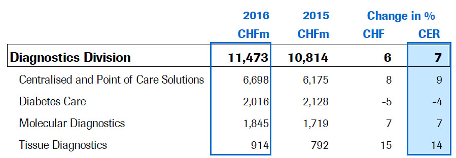 表1.罗氏2016年财务数据 (单位:百万瑞士法郎) 诊断产品线 罗氏诊断业务分为4大板块,分别是中心实验室和POC诊断(Centralised and Point of Care Solutions,之前称为专业诊断),糖尿病管理(Diabetes Care),分子诊断(Molecular Diagnostics)和组织诊断(Tissue Diagnostics)。 中心实验室和POC诊断功不可没,增长9%,其中免疫诊断和生化诊断分别增长13%和6%; 糖尿病管理业务由于美国市场的降价压力,下降4%,近两年糖尿病管理业务持续下滑; 分子诊断业务增长7%,其中微生物学诊断销售增长9%,HPV(人乳头状瘤病毒)筛查增长8%,得益于在很多国家中标,血液筛查业务也增长5%; 组织诊断增速达到14%,其中伴随诊断业务大增46%。