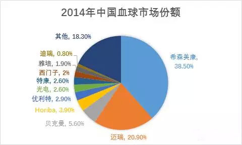 主治功能: 化学发光目前主要用于肿瘤、甲功、激素、传染病的检测。这些常规检测占整个市场金额的60%,占测试量份额的75%-80%。 在中国,这些检测占据市场金额80%的份额,某些套餐的应用广度与国家特点相关,比如药物滥用和药物检测,在欧美使用较广,中国相对较少。 3.血球市场 主题词:较成熟 3.1 简介 国产品牌替代最成功的细分市场 2015年血球中国市场约34亿元,2011-2015年平均增速11%。 希森美康和迈瑞医疗两家独大,占据60%份额。尽管如此,依然有新进入的变革者挑战现有稳定格局。 市场上新出现一些血球捆绑项目,比如全血CRP,仅此一个项目,预计会带来10亿市场空间。作为IVD重要细分市场,建议关注:嘉善嘉斯戴克(迈克生物控股)和帝迈(美康生物13.33%)。 血球产品在临床普及度高,市场竞争格局稳定