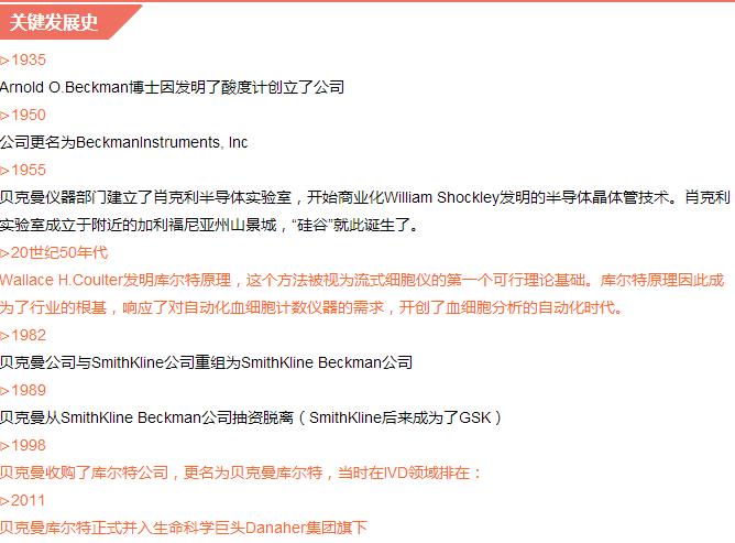 《2017全球顶级医疗器械巨头全攻略》—— Beckman Coulter业务概况 美国贝克曼库尔特有限公司研发、生产和销售全球领先的生命科学和临床诊断产品。 其客户遍布全球的制药和生物技术公司、大学、医学院、研究机构、医院、医师办公室,以及独立诊断实验室。 2011年,贝克曼被Danaher丹纳赫集团整体收购,成为Danaherqixia的 Life Sciences & Diagnostics业务中占比最大的公司。