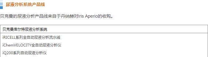 2016年Q1、Q2丹纳赫的生命科学和诊断业务因收购带来超过40%的同比增长;Q3开始诊断业务在财报里独立显示,同比增长3%;Q4诊断业务同比增长11%,其中因收购带来的营收增长占9.5%。 贝克曼库尔特诊断产品分析 贝克曼库尔特临床诊断主要产品包括:实验室自动化系统、生化分析系统、免疫分析系统、生化免疫一体化系统、血细胞分析系统、特定蛋白分析系统、尿液分析系统、微生物检测系列、血站血型分析系统。 免疫诊断产品线 在免疫领域,化学发光产品是红海:2003年西门子最早进入中国市场,随后贝克曼,雅培等企业纷至沓来。目前雅培在传染病领域拔得头筹,罗氏在肿瘤领域占领先机。 贝克曼的全自动化学发光分析系统是和巴斯德研究院合作设计的,主要分Access系列和DXI系列,其中DXI系列是高速仪器,可达400T/H,主推高端医院,甲状腺和激素项目属于拳头产品。其配套项目超过60个,涵盖:激素、肿瘤标志物、贫血、心脏标志物、产前筛查、传染病、甲状腺功能等12个大类。
